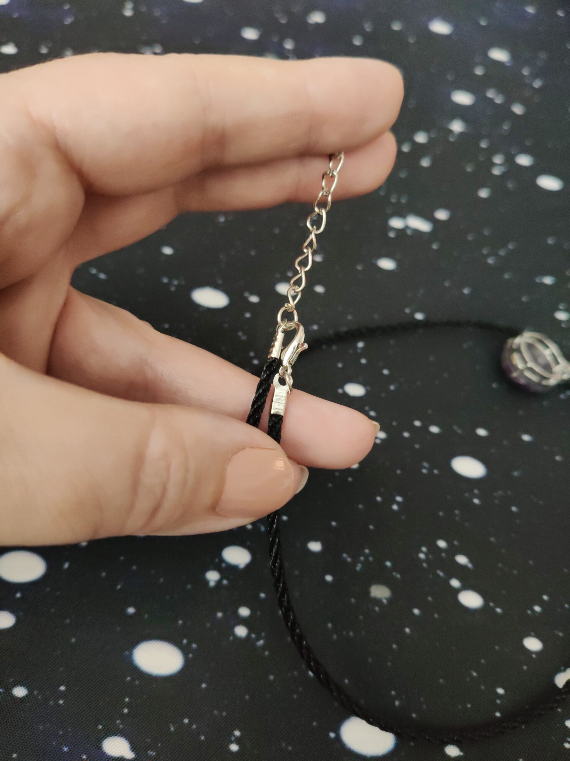 Metal pendant with Fluorite stone, braided black cord, and metal clasp, 45+5cm