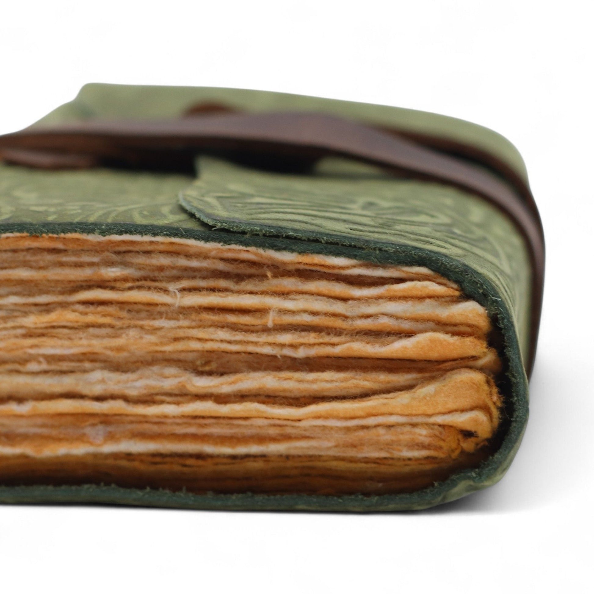 Un cuaderno de cuero compacto con un diseño en relieve de un laberinto verde y un acabado de borde deshilachado de aspecto rústico. El envoltorio de cuero natural mantiene tus páginas seguras, lo que lo hace perfecto para notas diarias, escritura creativa o hacer bocetos sobre la marcha.