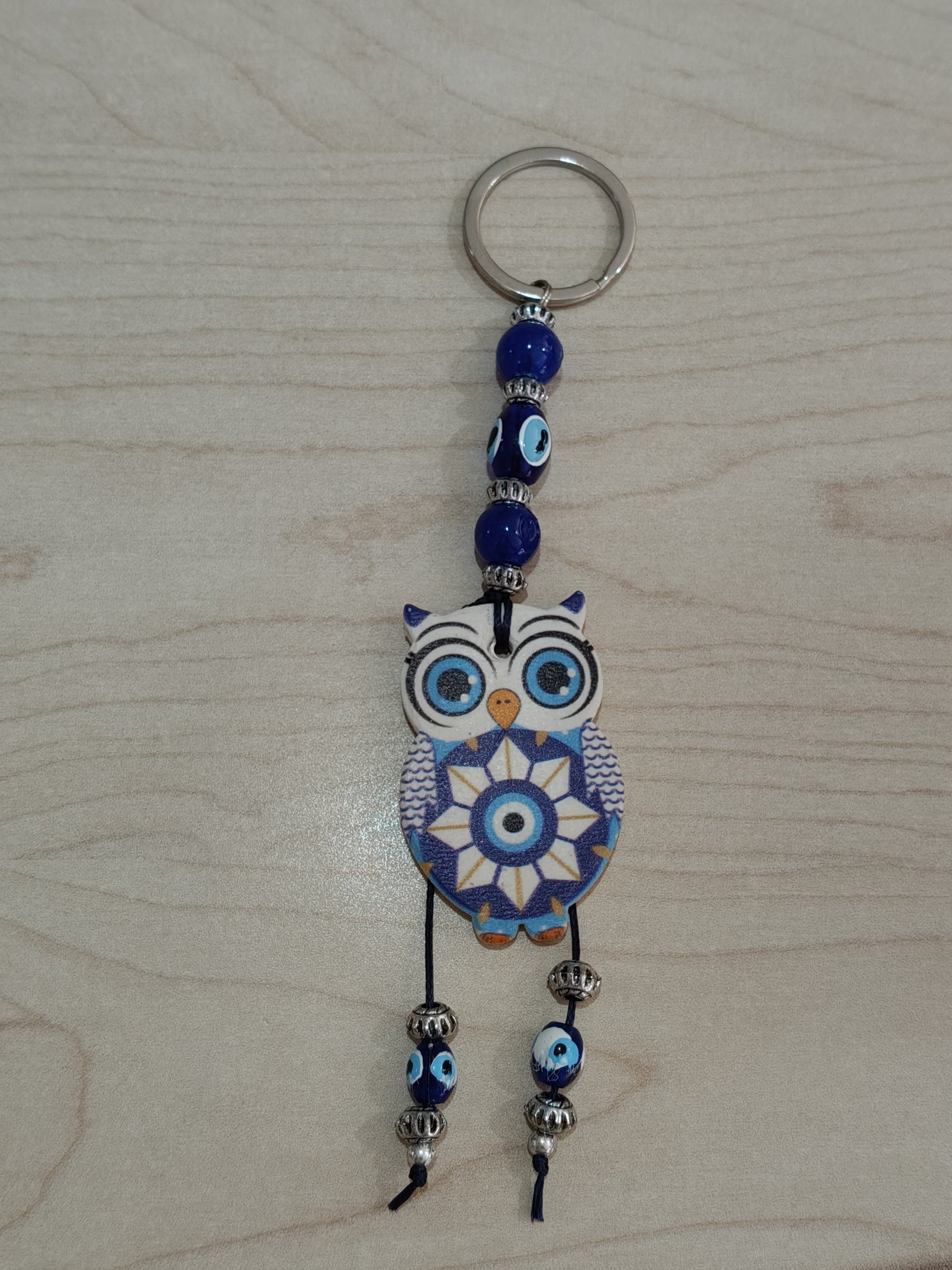 Protect your keys with this charming owl-shaped keychain featuring the evil eye symbol, known for its protection against bad luck and negative energies. In addition to keeping your keys organized, this keychain also provides a sense of security and peace of mind. Take it with you wherever you go!