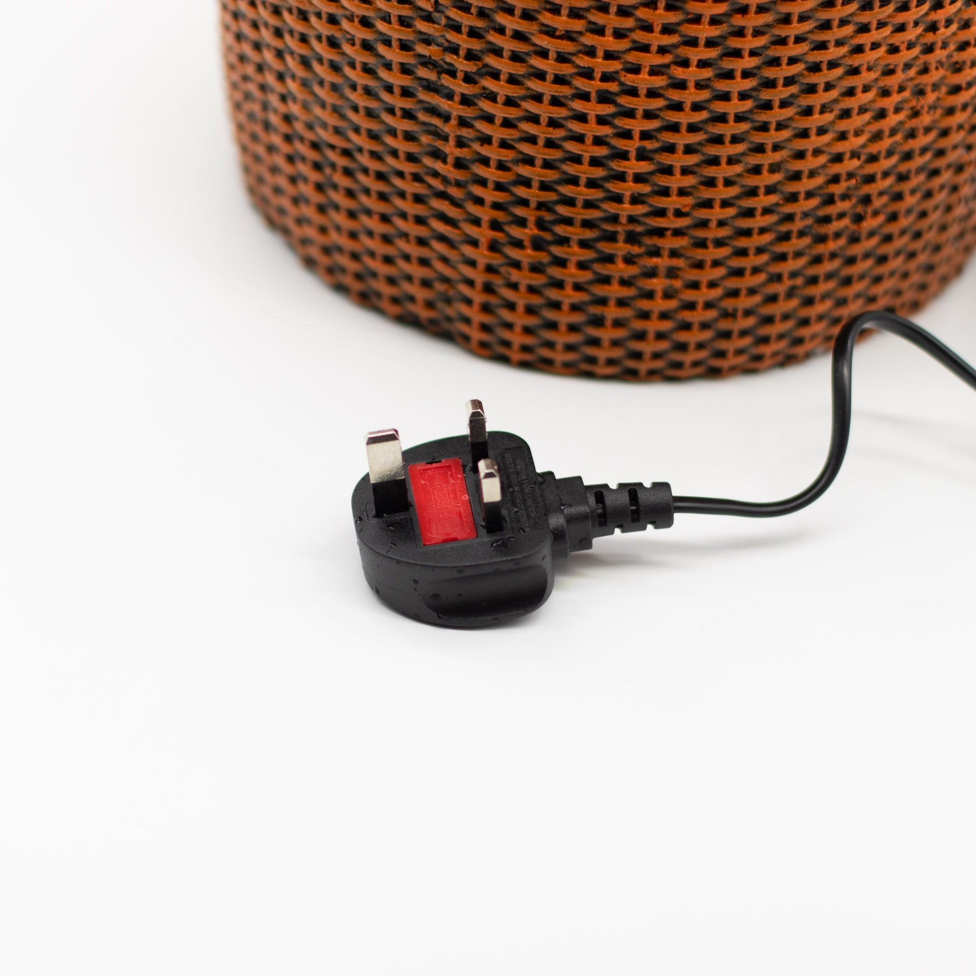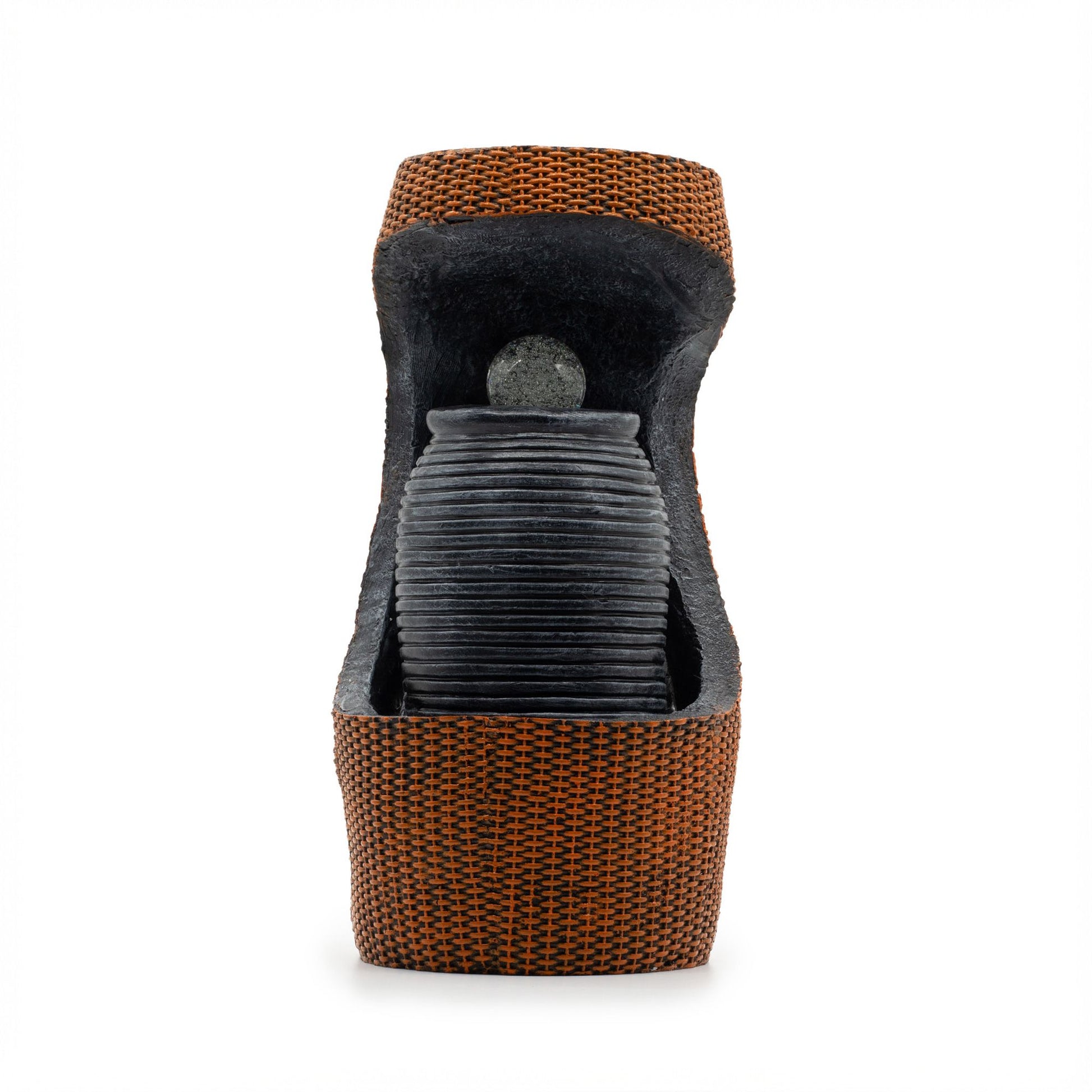 En el centro, el agua fluye suavemente sobre la superficie acanalada de la urna, guiando la mirada hacia la bola de cristal situada en la parte superior. Iluminada sutilmente con una luz LED que cambia de color, la bola de cristal se refleja a través del agua en movimiento, creando un brillo tranquilo y atmosférico que cambia a medida que cambian los colores. El contraste entre la urna de aspecto piedra oscura y la cálida textura de una cesta tejida añade profundidad e interés visual.