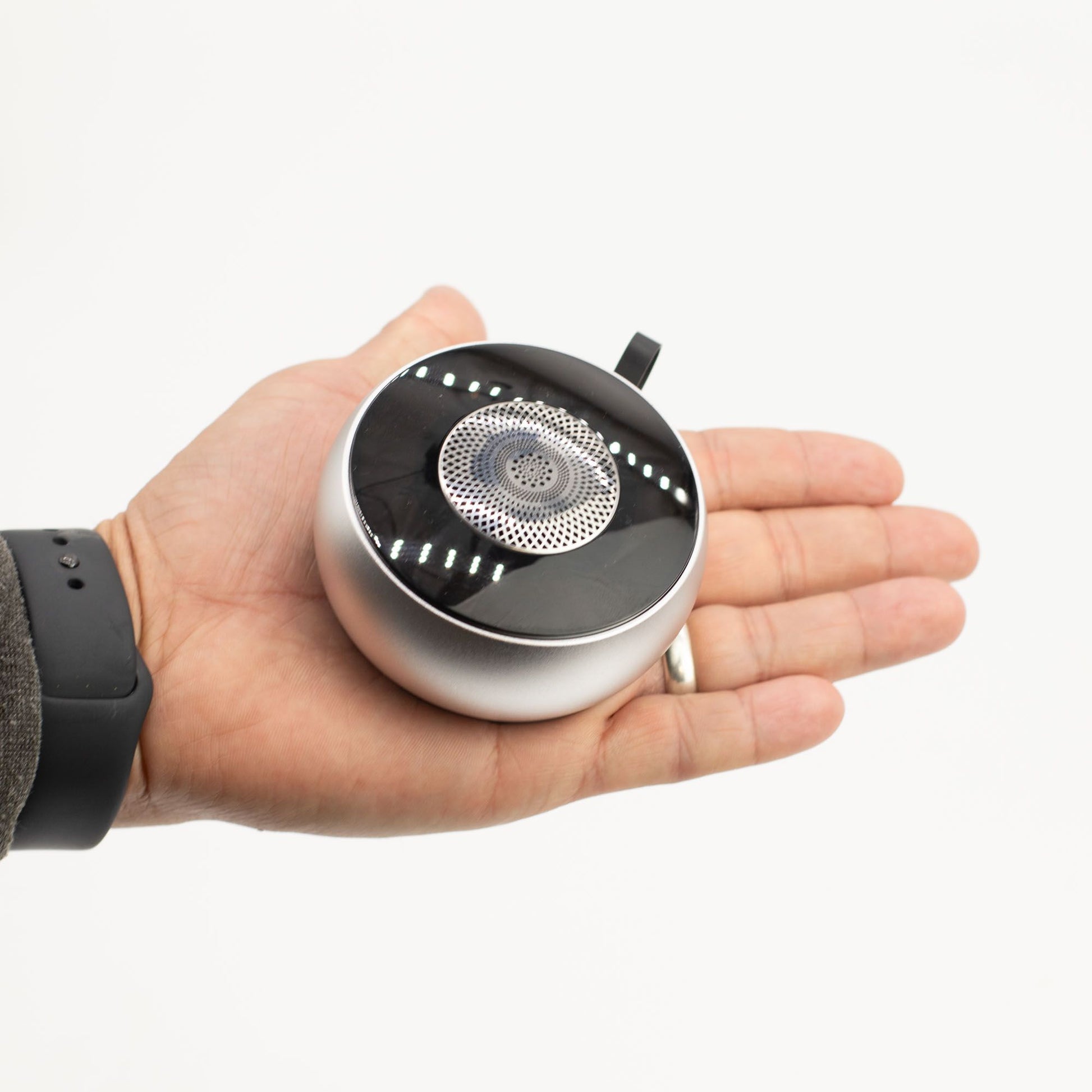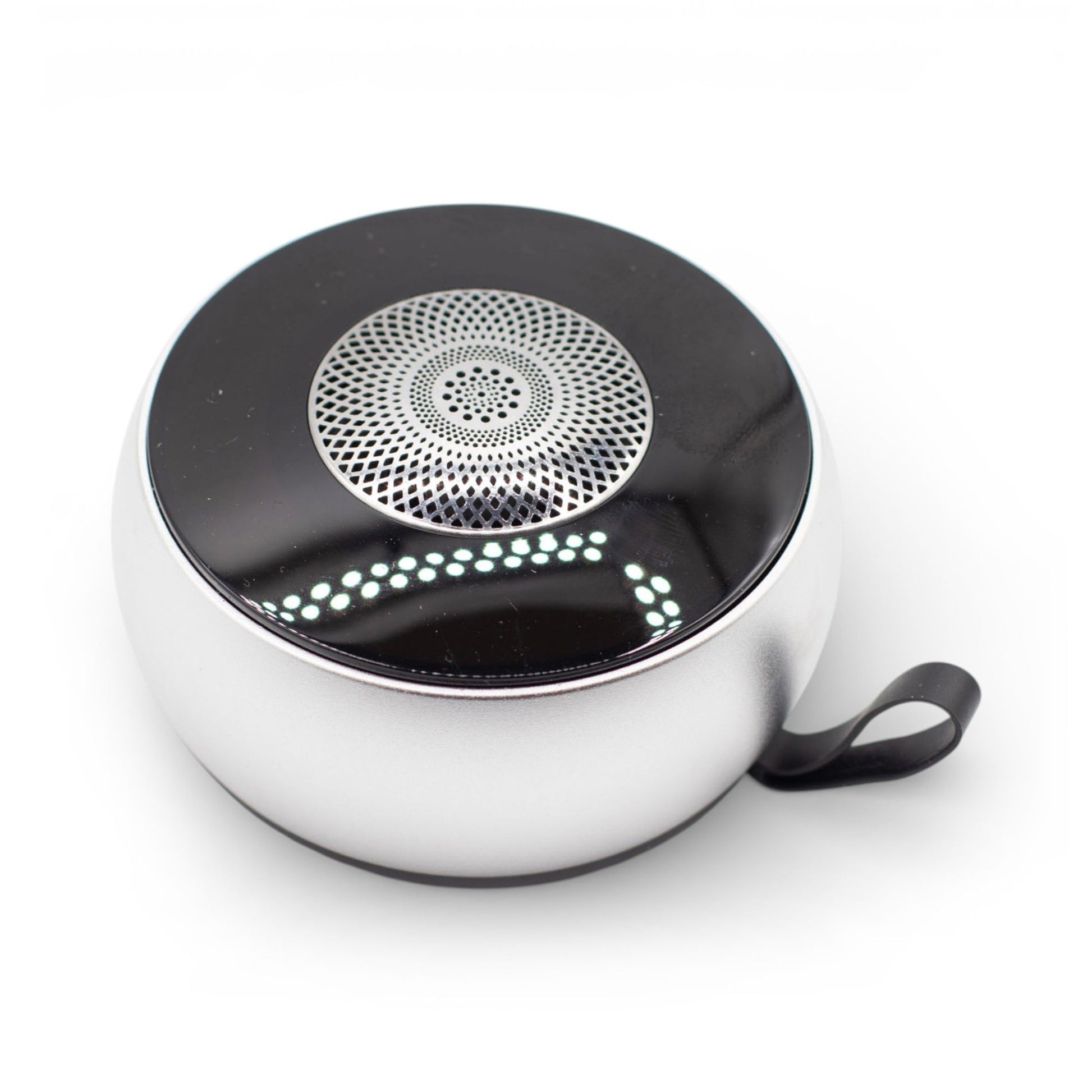 Un altavoz mini compacto con un acabado plateado y un efecto de iluminación de estilo mandala, diseñado para un uso diario y portátil. El diseño circular se ajusta cómodamente a la mano y cuenta con un lazo de transporte integrado para facilitar su transporte.