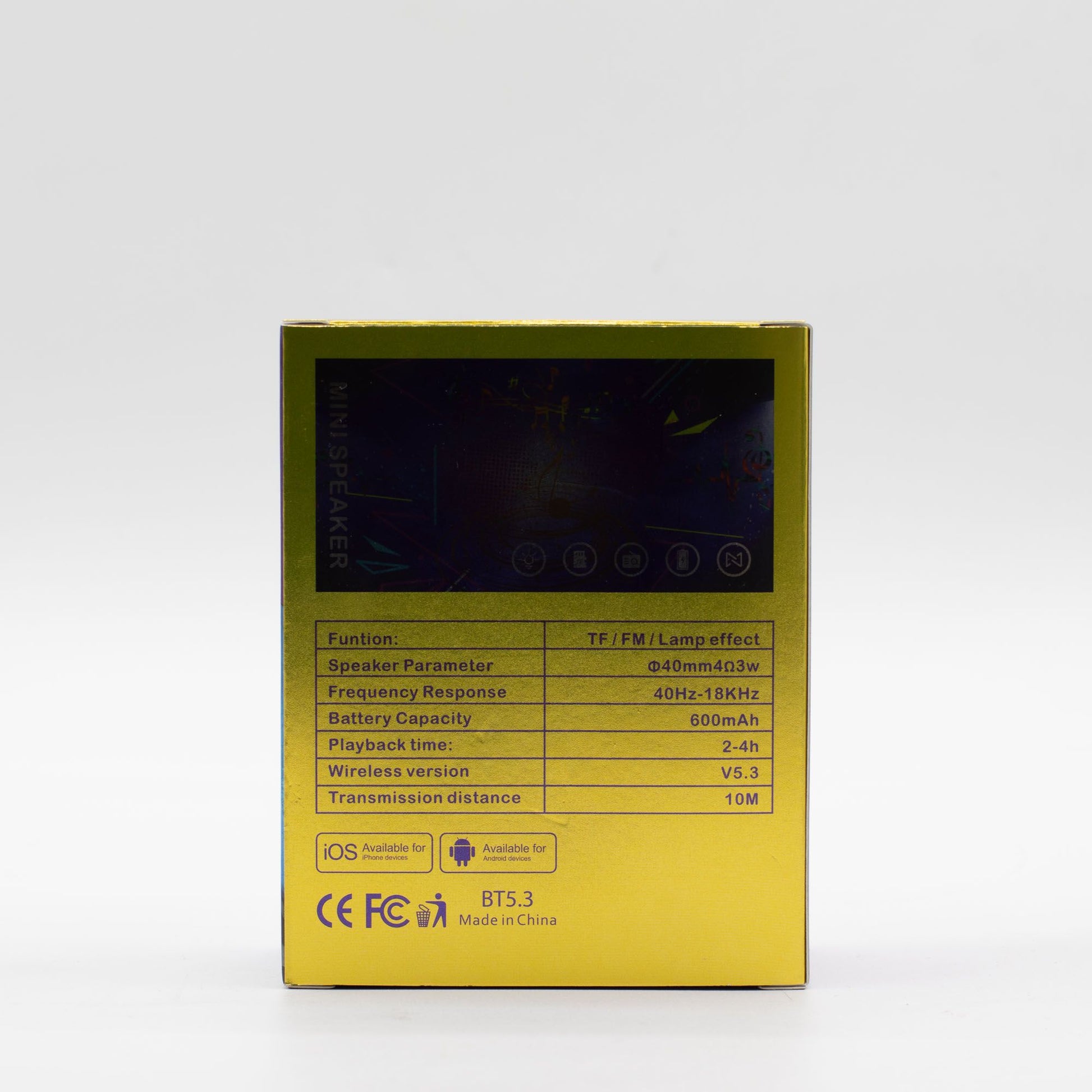 El altavoz admite la reproducción de audio inalámbrico vía Bluetooth 5.3 y cuenta con un efecto de luz LED integrado que se ilumina durante su uso. Funciona con una batería recargable de 600 mAh, que proporciona aproximadamente entre 2–4 horas de reproducción, dependiendo del volumen y del uso. La carga se realiza mediante un cable USB (incluido).