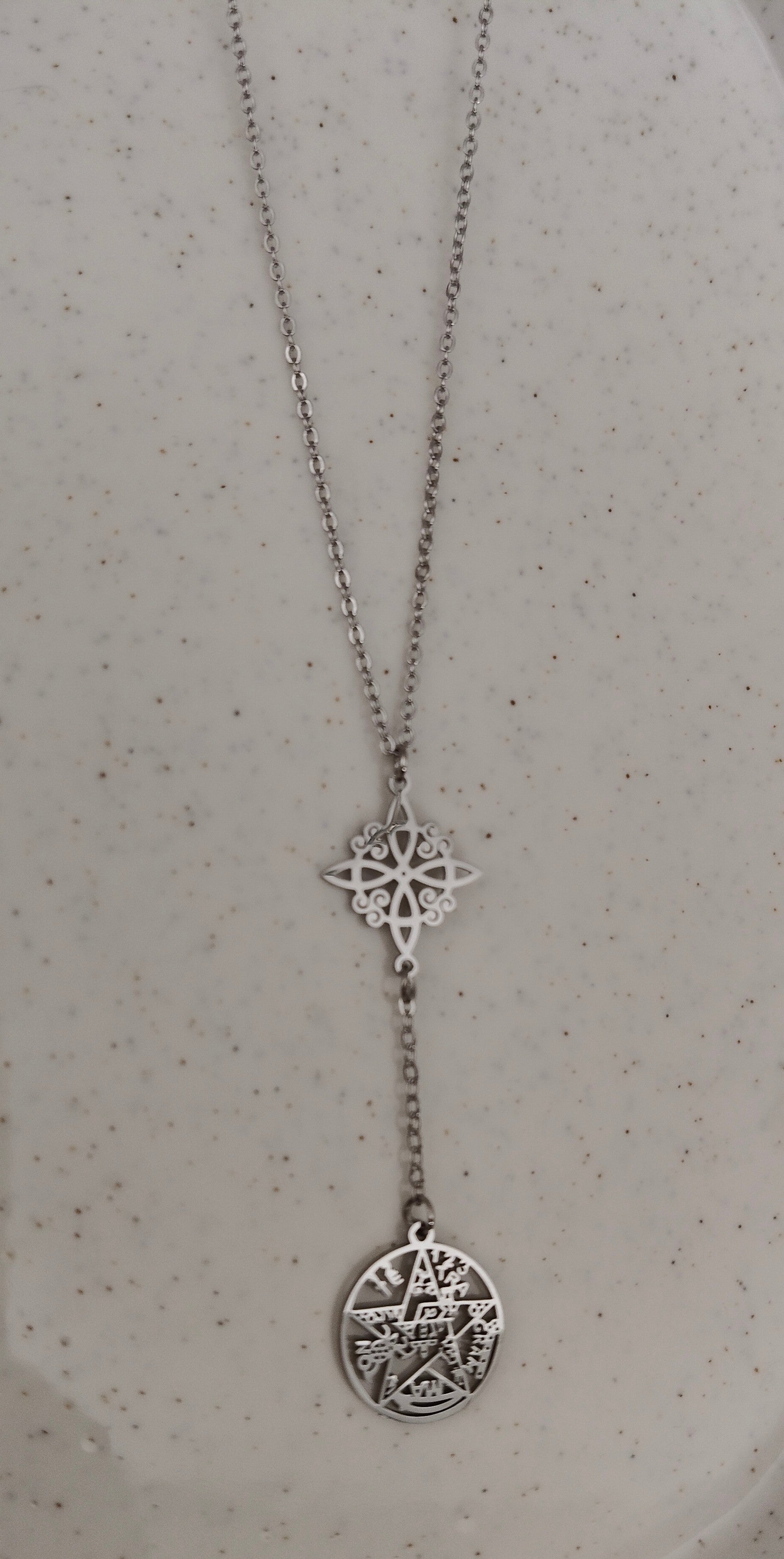 La combinación del Nudo de Bruja y el Tetragramatón en un amuleto ofrece una doble protección contra energías negativas. El Nudo de Bruja, asociado con la conexión con las fuerzas naturales y la protección espiritual, se entrelaza con el Tetragramatón, símbolo de defensa contra energías negativas y escudo de poder.