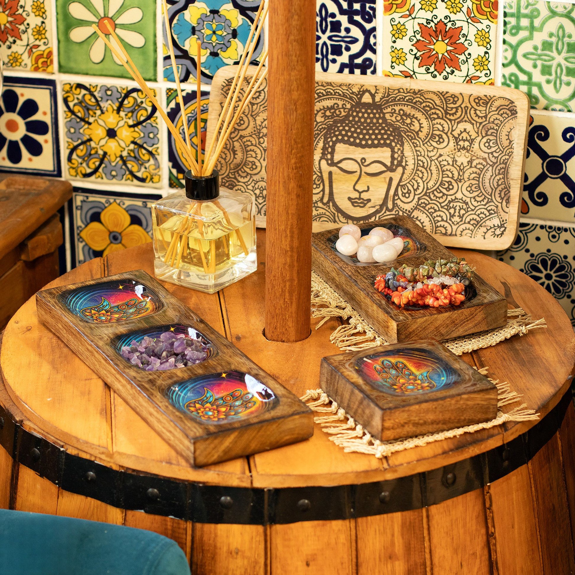 Este juego de bandejas de mango esmaltadas de tamaño mediano presenta el símbolo Hamsa, vibrante y protector, que ofrece una adición colorida y espiritual a su inventario. El conjunto consta de tres tamaños distintos: compartimentos simples, dobles y triples, fabricados con madera de mango maciza con un acabado suave y pulido.