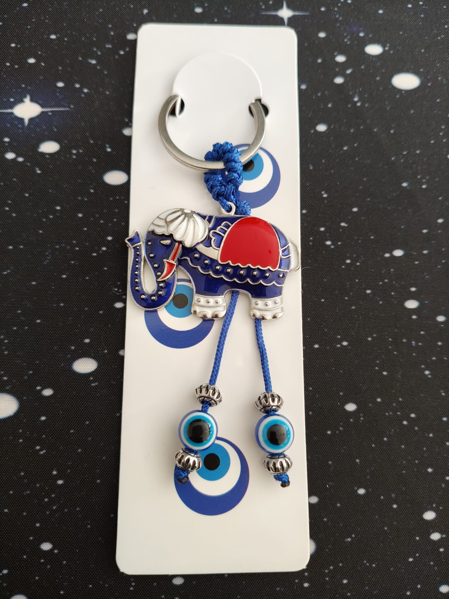 Llavero de diseño elegante que combina la simbología del elefante, emblema de sabiduría y protección, con el icónico ojo turco. Pieza artesanal en tonos tierra y azules profundos que refleja la estética mística de tu tienda. Accesorio versátil para bolsos o llaves, perfecto como regalo significativo para quienes aprecian amuletos con propósito. Detalle sofisticado que añade carácter a cualquier espacio personal.