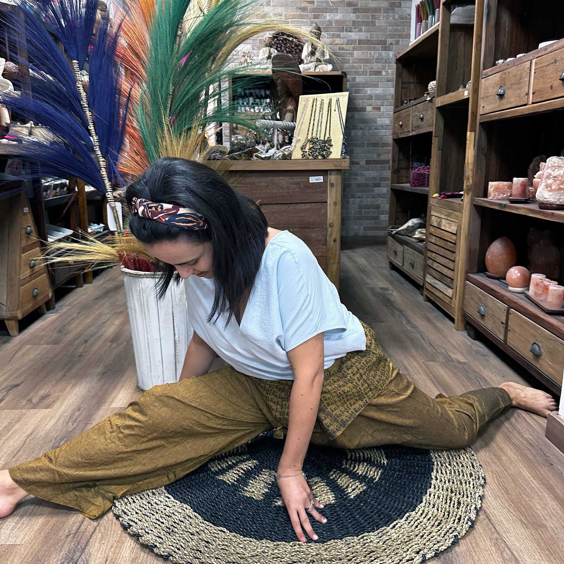 Estos pantalones de yoga y festivales presentan un diseño exclusivo con el mantra mandala del pescador tailandés en un vibrante color naranja. Su confección ligera y cómoda los hace perfectos tanto para la práctica de yoga como para eventos al aire libre. Además, incluyen una bolsa práctica para guardarlos y transportarlos con facilidad, manteniendo su forma y limpieza. Una prenda versátil que combina estilo y funcionalidad con toques culturales únicos.