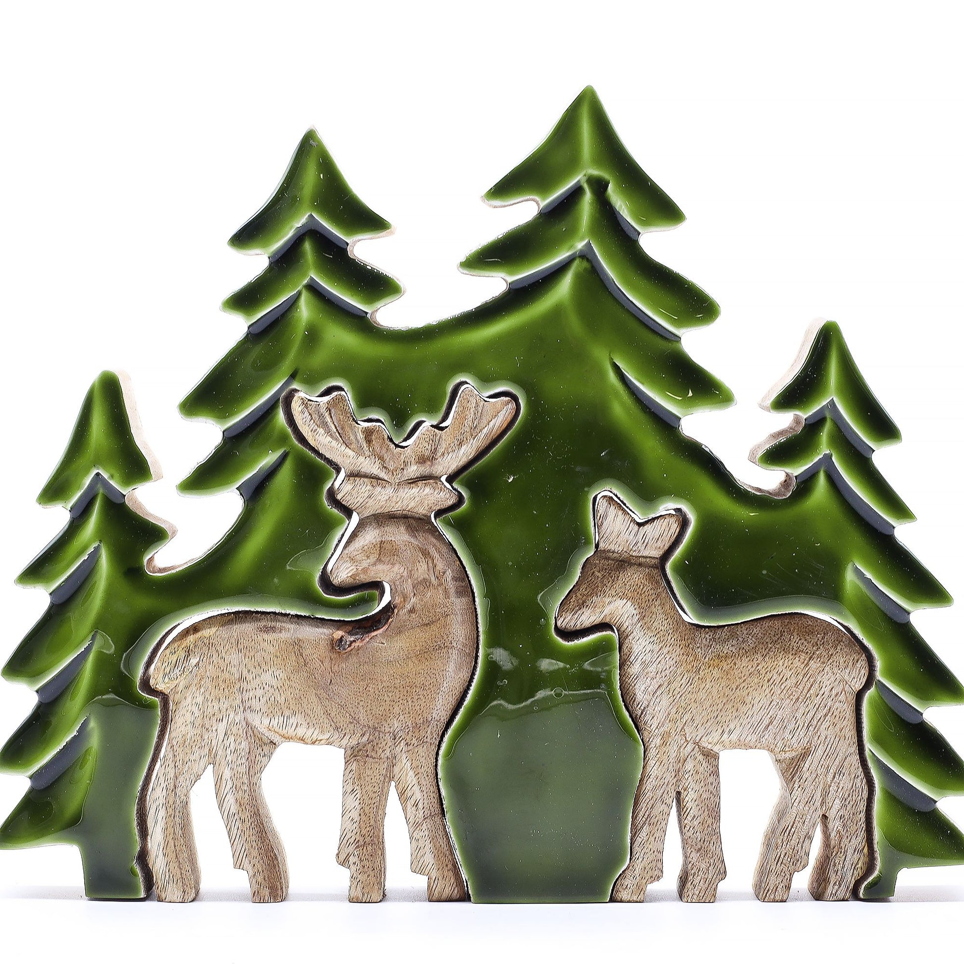 Celebra la silenciosa belleza de la naturaleza con este adorno de Dos Ciervos en el Bosque de la colección Lost in the Forest. Tallado a mano en madera de mango sostenible y acentuado con esmalte verde intenso, esta escena del bosque presenta dos ciervos de pie, tranquilamente, entre altos abetos. El efecto 3D en capas da vida a la escena, convirtiéndola en una pieza central conmovedora para exhibiciones de temporada.